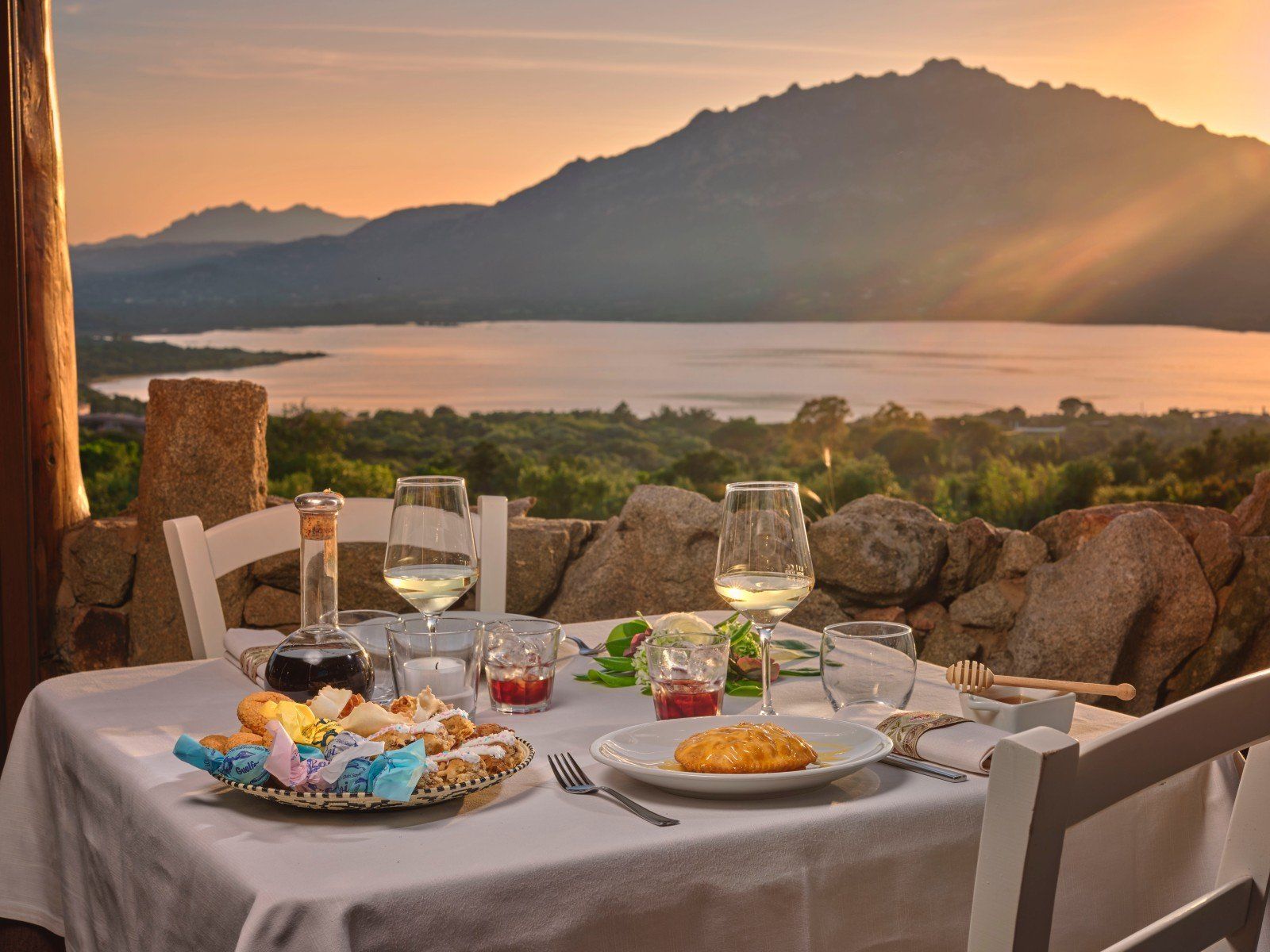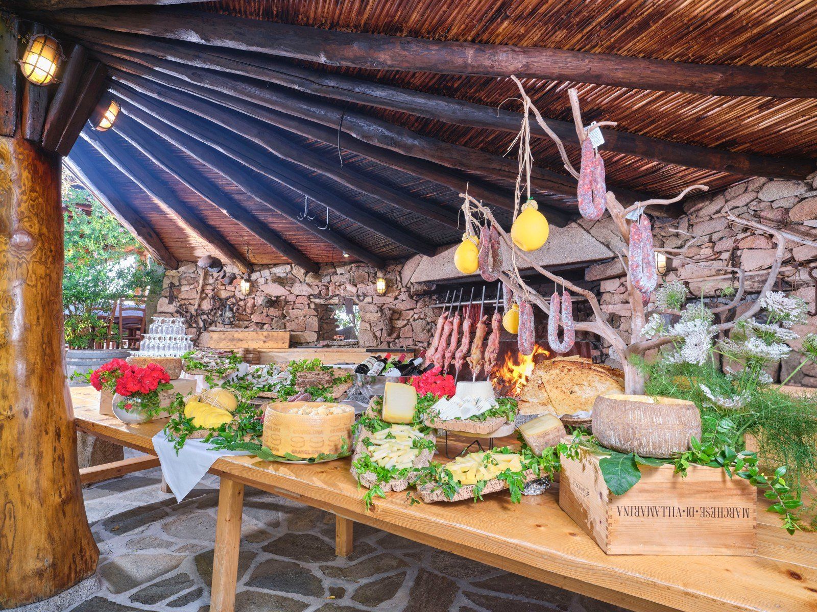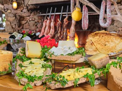 Tra le specialità della casa spiccano i formaggi tipici sardi, i primi piatti di gnocchetti, ravioli e culurgiones e le carni arrosto come il maialetto, l’agnello e il capretto allo spiedo. A completare il percorso gastronomico, i dolci della tradizione come le seadas con miele e un bicchiere di Cannonau, vino rosso intenso simbolo della Sardegna. Ogni pasto si conclude con un liquore di mirto, profumato e avvolgente, preparato secondo la ricetta tipica isolana.